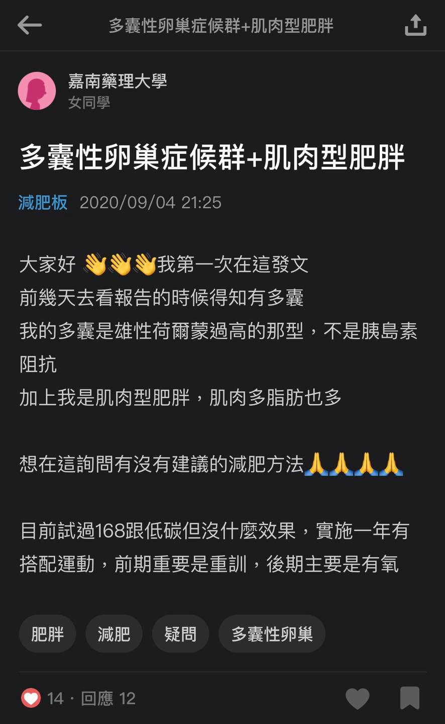 文章中原PO提到:「自己的多囊是屬於雄性荷爾蒙過高的肌肉型肥胖、不是胰島素阻抗的類型。」
